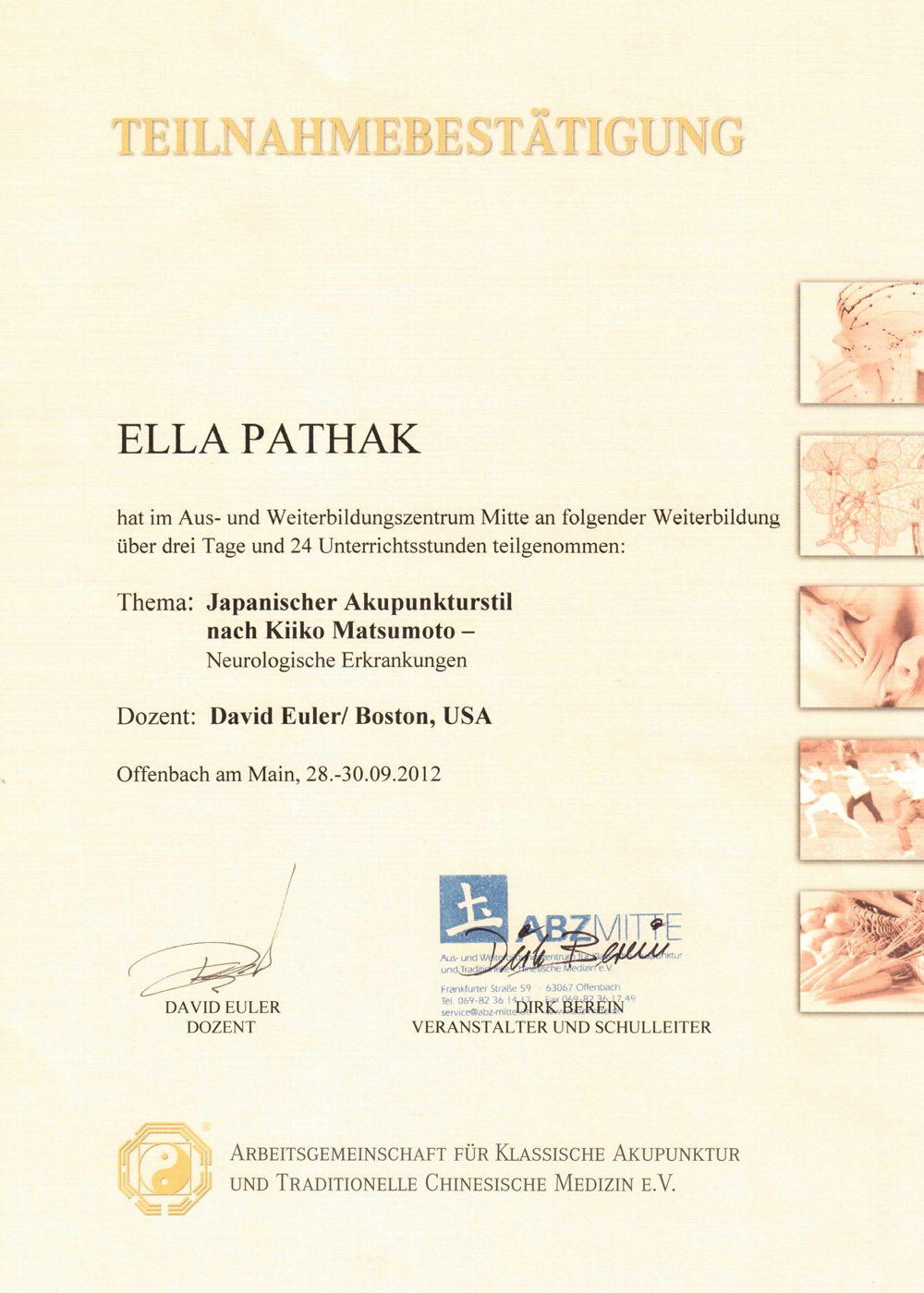 Seit 2008 betreibe ich meine eigene Praxis in Berlin. In den ersten Jahren arbeitete ich mit den Methoden der Traditionellen Chinesischen Medizin (TCM), bis ich die Japanische Akupunktur für mich entdeckte. Jetzt arbeite ich damit ausschließlich. Ich bin von der japanischen Akupunktur fasziniert und bilde mich stetig durch Seminare und Kurse in verschiedenen Ländern Europas weiter. Im Juni 2015 habe ich das Toyohari-Aufbaustudium in Amsterdam mit einem Diplom abgeschlossen.